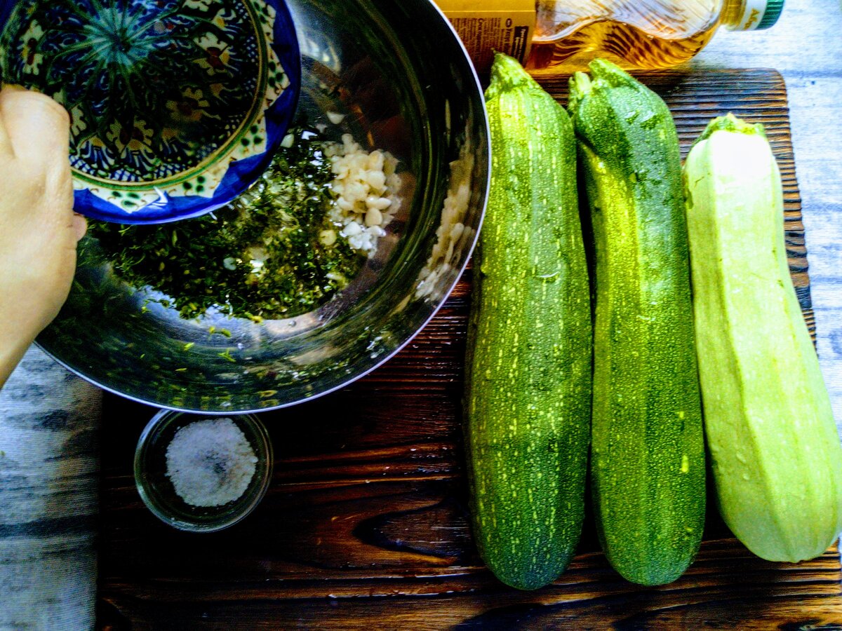 На три молодых кабачка я взяла 1,5ч.л. соли, 4 ложки яблочного уксуса, зелень, 5 зубчиков молодого чеснока, 50-70гр растительного масла.