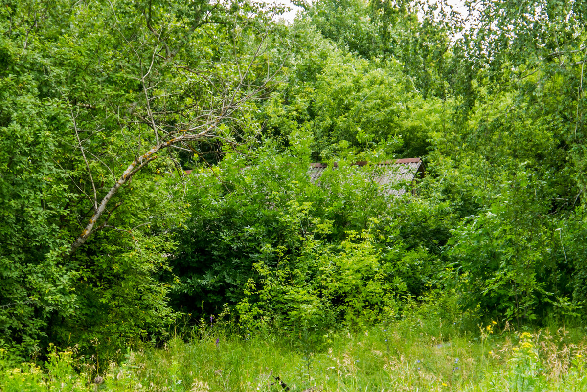 Продолжаю серию рассказов о нашем совместном походе с Александром, автором канала "Мир прошлого" по заброшенным местам. На этот раз мы посетили брошенный дом в одной вымирающей деревне. Целых домов там осталось около пяти. Тем не менее, мы не встретили в этой деревне не единой живой души. Либо эти дома используются как дачи, либо они тоже брошены, хоть и не очень давно, и еще не успели начать разрушаться. Но мы к таким домам даже не подходим близко. Мы заходим лишь в те, которые уже начали разрушаться, где нет дверей, окон. В таких домах уже точно давно никто не живет. Даже зайдя внутрь, мы ничего не трогаем. Просто показываем читателям и подписчикам, как раньше жили люди в деревнях и уходим. Все находки оставляем на том же месте, где они и лежали, и абсолютно ничего не уносим с собой. Вот один из таких полуразрушенных и заброшенных домов мы и нашли. Он так сильно зарос кустами, что мы его чуть было не проехали. Еле-еле заметили выступающую из зарослей часть крыши. Перед этим домом мы