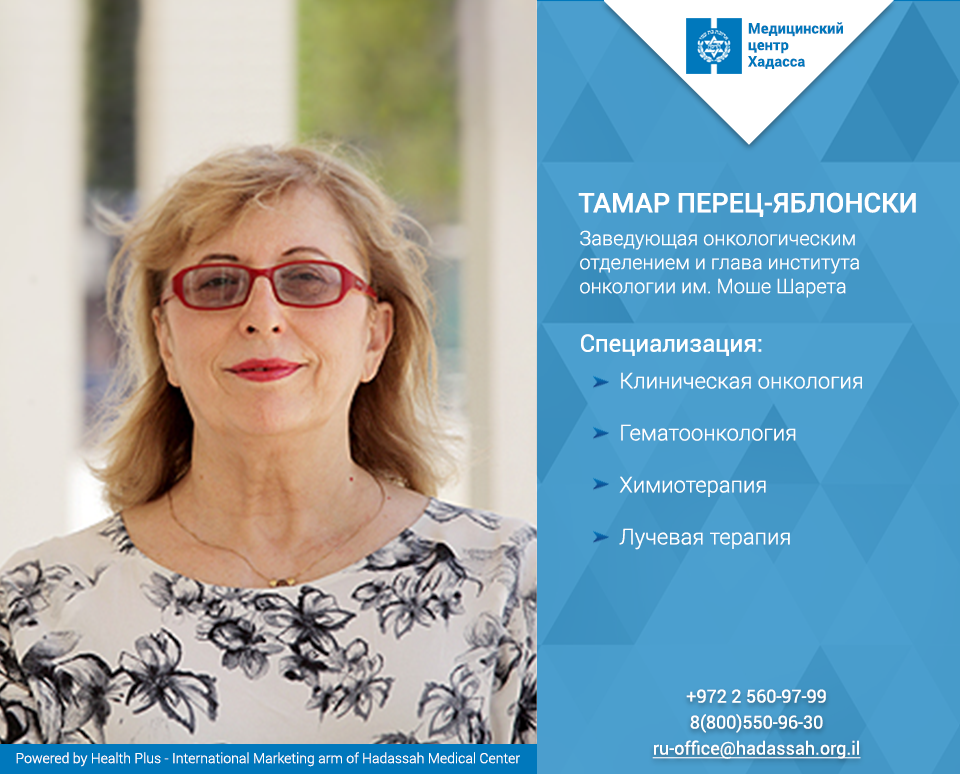 «Я думаю, что лет через 20 в Израиле научатся лечить большинство разновидностей рака, а часть из них превратится в обычные хронические заболевания». Профессор Тамар Яблонски-Перец, заведующая институтом им. Моше Шарета, из интервью ежедневной газете «Израиль сегодня», 28.12.2012 Институт онкологии им. Моше Шарета при клинике Хадасса был основан в 1977 году как национальный Центр по исследованию рака, методов лечения и профилактики. Сегодня Шарет – мировой лидер по созданию и внедрению противораковых лекарств. В Хадассе регулярно проводятся безопасные клинические испытания новых препаратов, большинство из которых подтвердили свою высокую эффективность. Со дня основания Шарета десятки тысяч жизней были спасены благодаря индивидуальному подходу, точным генетическим исследованиям (InVitae, Caris Target Now и Foundation One) и уникальному техническому оснащению клиники. Тамар Яблонски-Перец возглавляет институт онкологии им. Моше Шарета и заведует онкологическим отделением начиная с 19