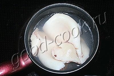 Для смазывания свекольного слоя я использовала сметану. У неё более лёгкий ненавязчивый вкус. Но при желании можно взять и майонез, но тогда нужно быть осторожнее с подсаливанием свёклы. СОСТАВ На 4 порции 1 варёная свёкла среднего размера (150~200г), 2 небольших кальмара (150~200г), 2 средние луковицы (~200г), 2 ст ложки растительного масла (~35г), 3~4 ст ложки сметаны или майонеза, щепотка соли посмотреть калорийность» Кальмаров ошпарить кипящей водой и сразу же под струёй ледяной воды смыть с них свернувшуюся кожицу.