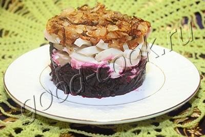 Приятное сочетание влажной сладковатой свёклы, нежного кальмара и похрустывающего жареного лука.