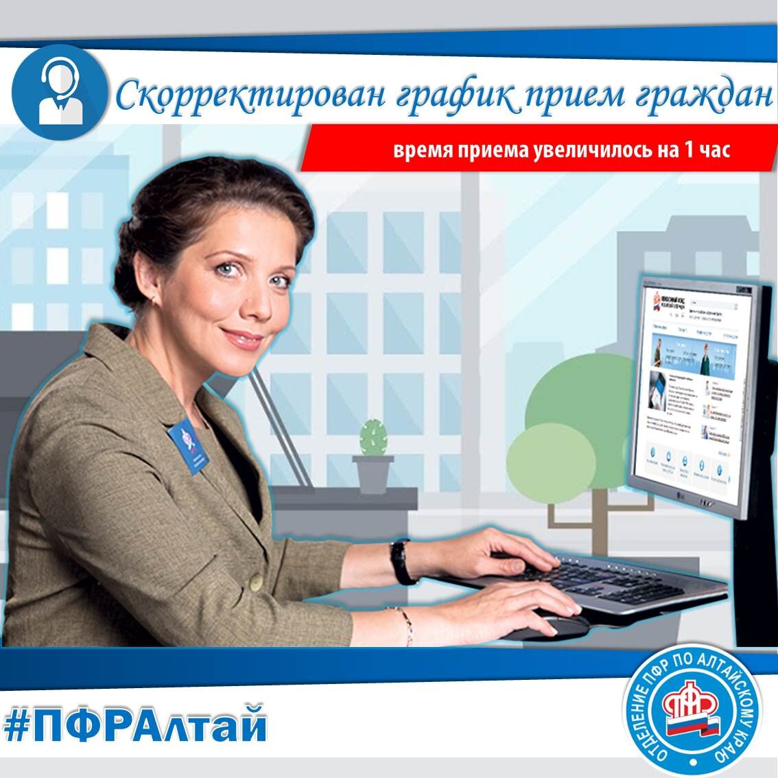 В краевом пенсионном ведомстве изменился график приема граждан, время приема увеличилось на час. Напомним, что непосредственно сам прием ведется по адресу: г.Барнаул, ул.Партизанская, 94, каб. 105. Прием граждан осуществляют не реже одного раза в месяц и управляющий Отделением, и его заместители по всем вопросам, входящим в круг их компетенций, а также ведущий специалист-эксперт отдела по работе с обращениями. Итак, прием граждан ведется в рабочие дни, с понедельника по четверг, с 08.00 до 17.00 час., а в пятницу - с 08.00 до 16.00 час. Выходные дни: суббота, воскресенье. Перерыв на обед: с 12.00 до 12.48 час. Прием проводит дежурный специалист. График приема граждан руководством: каждый второй вторник месяца с 9.00 до 11.00 час. - управляющий Отделением Трофимов Борис Александрович; каждый третий вторник месяца с 9.00 до 11.00 час. - заместитель управляющего Отделением Хомутов Алексей Борисович; каждый четвертый вторник месяца с 9.00 до 11.00 час. - заместитель управляющего Отделением