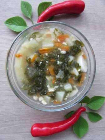 Ингредиенты: картошка - 3 шт, морковь - 1 шт, щавель - пучок, яйца - 3шт, куриный бульон, соль по вкусу. Приготовление: Вначале отварим небольшой кусок курицы. В полученный бульон отправляем мелко нарезанную морковь, затем картофель. Яйца отварим в отдельной кастрюле. Щавель обдадим кипятком. И когда картофель сварится, отправляем щавель. Отключаем печку. Добавляем нарезанные яйца. Подавать со сметаной.