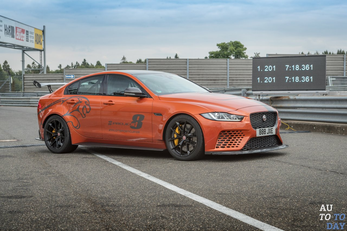 Разработанный подразделением Jaguar Special Vehicle Operations автомобиль Jaguar XE SV Project 8 продемонстрировал полный спектр своих технических возможностей, установив новое рекордное время, за которое четырёхдверный серийный автомобиль прошел трассу Нюрбургринг Нордшляйфе: 7 минут 18,361 секунды. Новое официально зарегистрированное время завершения 20,6 км трассы на 2,9 секунды короче, чем предыдущий рекорд, установленный Jaguar XE SV Project 8 в ноябре 2017 года, и на 7 секунд короче, чем время, которого смогли достичь другие четырёхдверные седаны. Jaguar XE SV Project 8 стал первым автомобилем среднего класса, который установил официальный рекорд прохождения трассы в Нюрбургринге длиной 20,8 км – за 7 минут 23,164 секунды. На немецкую трассу в двухместной модификации Track Pack автомобиля Jaguar XE SV Project 8 вернулся водитель из команды разработки Винсент Радермекер. Благодаря пружинно-гидравлическому амортизатору клиренс автомобиля был отрегулирован на соответствующей