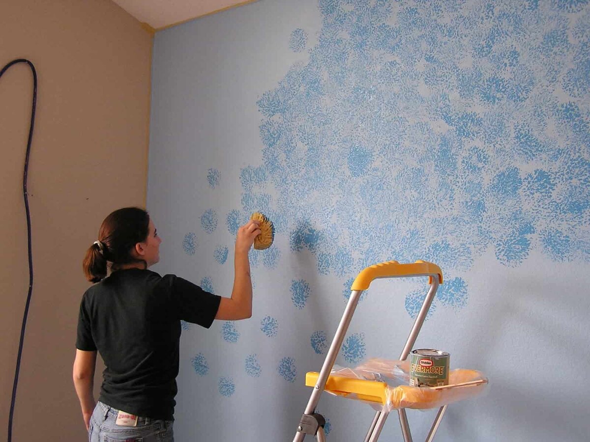 Начинают работу с покраски углов. Для этого можно использовать кисть. При окрашивании используйте валик длиной 18 — 25 см. Полосы наносимой краски должны быть шириной в 2,5 — 3 валика. Валик должен иметь ворс средней длины, а вот инструмент из поролона лучше не применять: этот материал сильно впитывает краску и контролировать ее количество практически невозможно. Красить начинают от окна, постепенно переходя вглубь помещения. Первый слой кладут поперек пути солнечных лучей, а второй — вдоль. Чтобы избежать появления полос. После того как на валике практически не останется краски, им проходят по уже окрашенной поверхности. Таким образом удаляют излишки краски, которая может образовать на потолке полосы. Растирать окрашенную поверхность совершенно сухим инструментом не стоит. Иначе на потолке останутся полосы, а сам слой покрытия будет неоднородным. Избежать наплывов можно, следя за тем, чтобы на валике постоянно было примерно равное количество краски. Для этого необходимо чаще обмакив