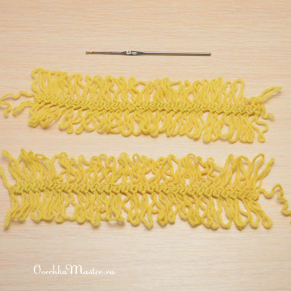 Для образцов я подготовила 2 полосы. Я специально не обрабатывала края, чтобы показать, как можно получить целое полотно, соединяя вот такие простые полосы с вытянутыми петлями.