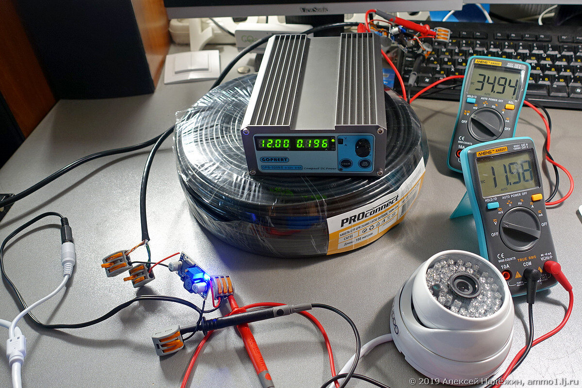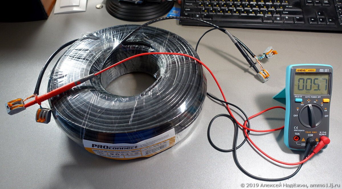 Купольная камера AZISHN (ammo1.livejournal.com/1053037.html) будет получать питание через 50-метровый кабель Proconnect 01-0045-3 (ammo1.livejournal.com/1063728.html). Чтобы не отрезать 50 метров кабеля я замкнул по 4 провода в 100 метровой бухте. Сопротивление одной линии из четырёх проводов получилось 5.6 Ом, второй - 5.7 Ом.