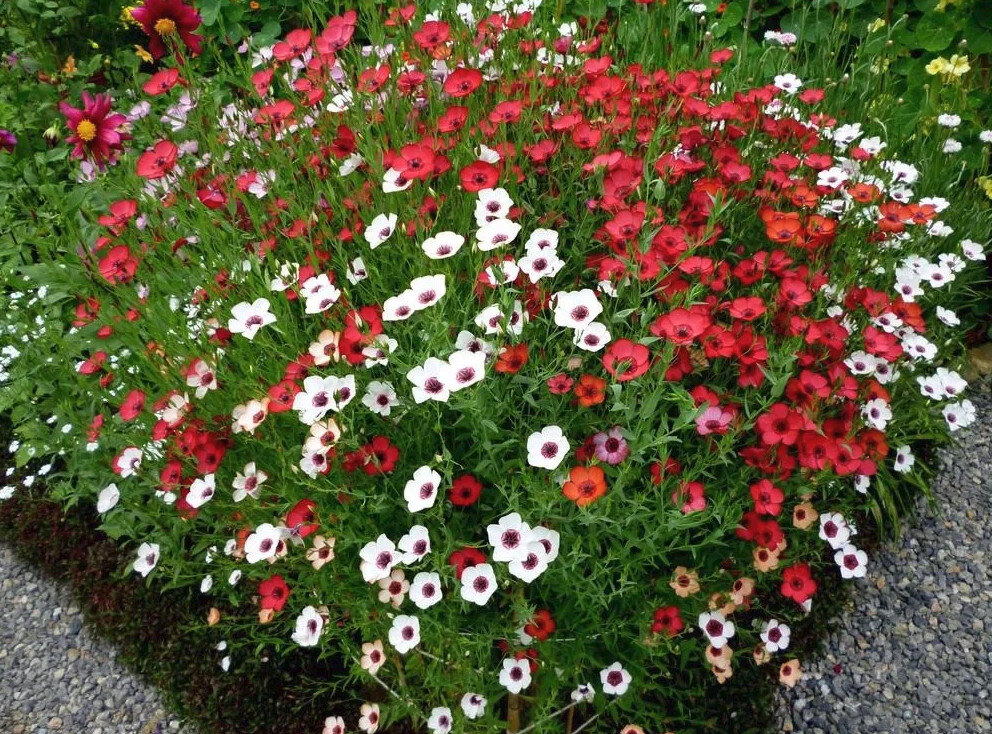Лен будет цвести все лето, расцветка его соцветий может быть розового, голубого и белого цвета. В высоту вырастет примерно 70 см, высаживать лучше всего на солнечном и влажном месте.