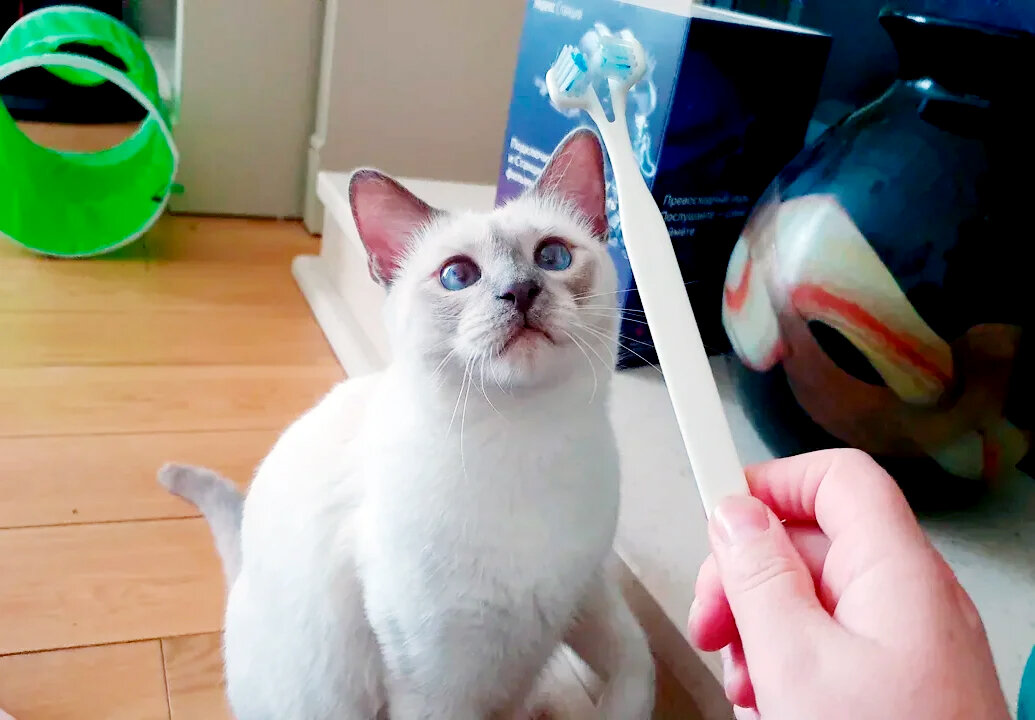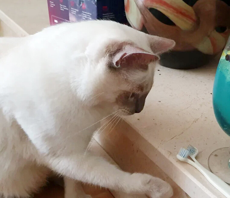 Попалась мне на глаза ЗАЧЕМ-ТО купленная пару лет назад (еще для нашего старшего кота Стёпы) щетка для чистки зубов... Вот только не пойму я теперь - для котов ли это щетка (а чего такая большая?) или для собак? Мы, а точнее - коты, щеткой этой никогда не пользовались и она у нас хранилась среди "архива" кошачьих игрушек, который я, не пойми с какой надобности, распотрошила... Митя сразу заприметил, что появилось что-то новенькое, доселе им неизведанное, не искусанное, никуда не утащенное. А я конечно же дала и понюхать, и погрызть, и поиграться - жалко мне что ли? Все-равно ведь лежит бесхозная столько времени. Срока годности вроде не имеет, помыть от пыли и "вот тебе, котик, играйся"... Митя сперва не очень понимал, что это за штуку я ему пихаю, для чего она и что в ней вообще может быть для него интересное: скучная палка, не звенит, без перьев, без меха, без шерсти, не муха... Пришлось Мите объяснить (нет-нет, не наглядным примером), что грызть ее надо и тем самым чистить зубы...