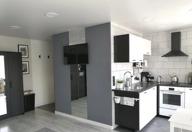 Это была обычная однокомнатная квартира в кирпичном пятиэтажном доме, но так как первоначальная планировка не очень удобна: маленький узкий коридор, кухня около 6 м. кв. и ванная комната в которой с трудом помещается унитаз, ванна, раковина и, не всегда входит стиральная машинка. Квартира досталась от бабушки, но прежде чем в нее переехать жить молодая семейная пара решила, сделать перепланировку. Первоначально демонтировали стены: между коридором и комнатой, комнатой и кухней. Стену между комнатой и ванной так же убрали, затем установили новую (из кирпича), которую перенесли почти на 0,50 см. благодаря чему расширили ванную комнату. Так же были сняты деревянные полы, затем выровнены по маячкам, сделан наливной пол. В коридоре и кухне положена кафельная плитка, а в комнате ламинат. Заменены: система водоснабжения, отопления, радиаторы и полностью электро-проводка, после чего все стены выровняли штукатуркой по маячкам, зашпаклевали. В комнате наклеены обои двух видов две стены светл
