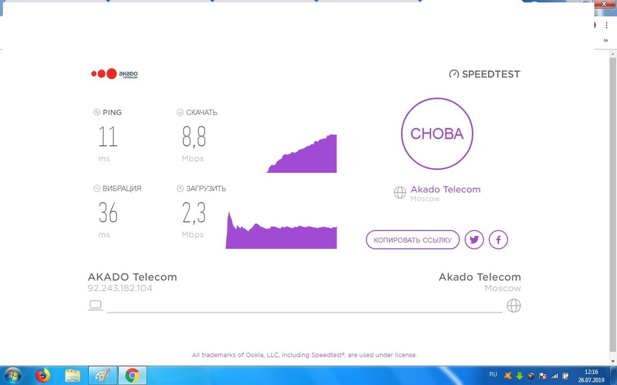 АКАДО13 часов Здравствуйте. Замер скорости рекомендуем производить при прямом подключении нашего кабеля к ПК на сайте akado.ru в разделе Сервис и помощь -> Проверка скорости (http://www.akado.ru/sub/speed.xml) с отключенным защитным программным обеспечением (антивирус, файерволл и пр.) и отключенными потребителями трафика (торрент – клиенты, менеджеры загрузок и пр.). Тарифная скорость достигается при подключении по кабелю, при этом нужно отключиться от WiFi сети для корректной проверки. Уточните, пожалуйста, номер Вашего договора. Технические специалисты проверят линию на Вашем направлении, свяжутся для диагностики. Но пока со мной никто не связался, а предложение отключить все программы и прочие "нагрузки" , а пот