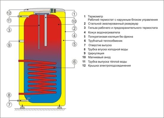 На схеме изображен бойлер косвенного нагрева в разрезе.