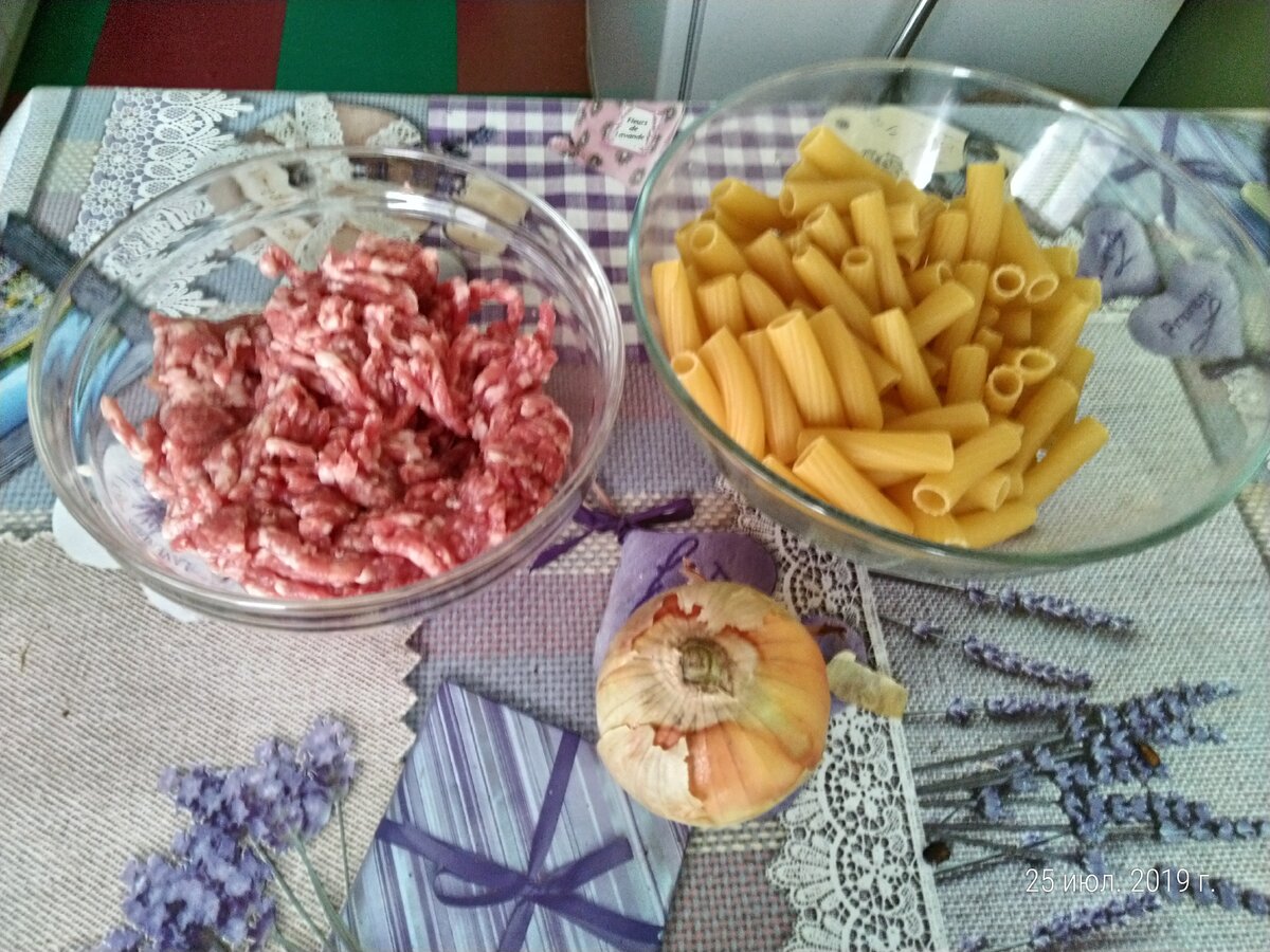 Фарш 250 грамм свинина-говядина , макаронные изделия крупные трубочки , одна луковица, масло растительное 2 ст.ложки , соль по вкусу, чайная ложка аджики.