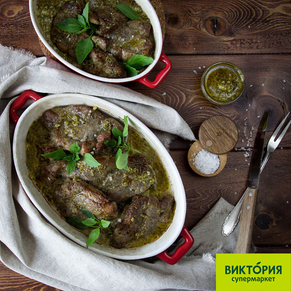 Шаг 2 Шейку нарезать на стейки толщиной 3 см, посолить. Смазать форму для запекания разительным маслом. Выложить в неё мясо, обильно полить соусом песто. Выпекать при температуре 180°С в течение 40 мин.
