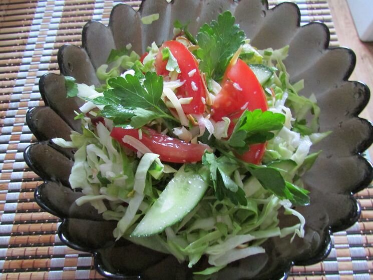 Без овощей здоровый человек не мыслит своей жизни, поэтому каждый день мы готовим свежие салаты. Порой привычный рецепт салата хочется обновить необычным ингредиентом, который придаст новые вкусовые качества. Недавно я приготовила салат с помидорами и капустой с сыром сулугуни, и моя семья осталась очень довольна. Салат получился легким, витаминным, но в то же время сытным и питательным из-за добавления сыра. Как приготовить салат из капусты с сулугуни Рецепт очень простой и не займет много времени. Моем капусту, высушиваем и нарезаем мелкими полосками. Помидоры, огурцы нарезаем небольшими кусочками. Любимую зелень и сулугуни рубим ножом не слишком мелко. Ингредиенты перемешиваем, солим, перчим, заправляем оливковым маслом и по желанию взбрызгиваем лимонным соком. Ингредиенты: 1. Белокочанная или пекинская капуста – ½ кочана. 2. Помидор салатный – 1 штука. 3. Огурец свежий – 1 штука. 4. Сулугуни (сливочный или подкопченный) – 100 грамм. Можно при желании натереть на терке