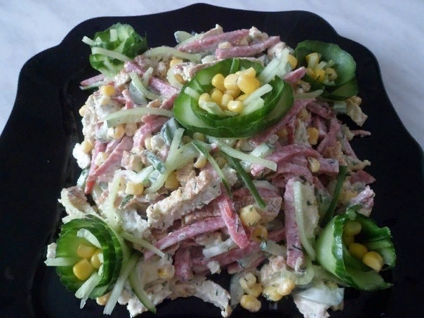 майонез или сметана Способ приготовления: Колбасу и огурец порезать соломкой, из яиц сделать омлет, дать остыть, также нарезать соломкой, добавить кукурузу, добавить майонез, зелень, и перемешать