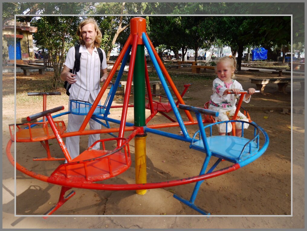 Приплыли мы в город Кочи ранним утром. Сразу за паромной переправой – парк с качелями-лазалками, Алиса у нас давно уже не видала такого))) С удовольствием покаталась там, и с ребятишками немного пообщалась. Потом мы зашли в ресторанчик попить чай и сок, и увидели там очень странных рыб в аквариуме. А после вкусного чая пошли гулять по улицам и рассматривать достопримечательности. Но спокойно погулять нам не давали рикши: издалека завидев туриста, подбегают и предлагают (весьма настойчиво) покатать по району и продемонстрировать все достопримечательности. Правда, за свои услуги просят совсем недорого: 50 рупий за час. Алиса у нас, конечно же, быстро устала ходить, поэтому мы воспользовались этим предложением. Приехали в Музей Васко Да Гамы. Пока наш папа ходил в сам музей, мы с Алисой гуляли по его территории, которая была вся засажена плодовыми деревьями: бананы, папайя, джекфрукт, хлебное дерево – красота! Алиса облазила все кусты, потрогала все плоды – какой там музей))) Пото