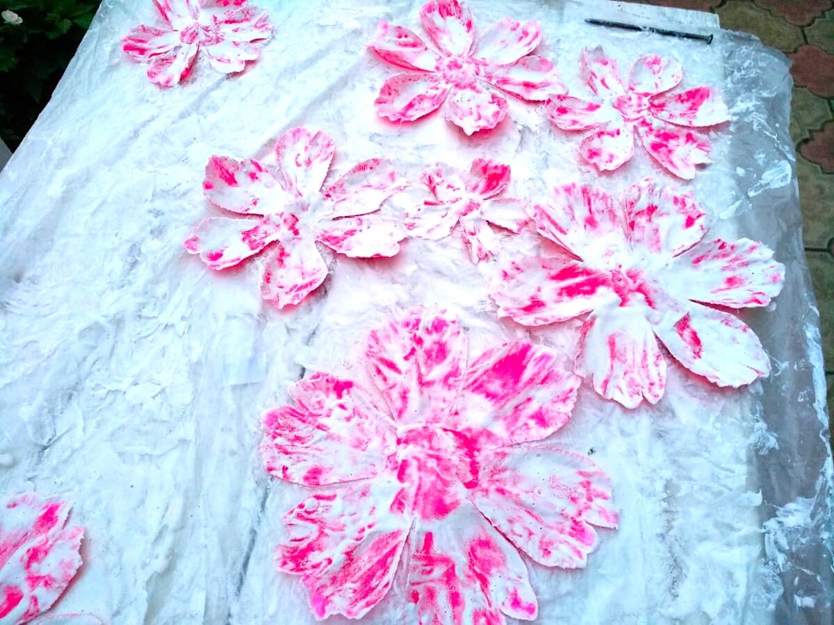 Недавно увидела в интернете крутые подсвечники из гипсовых цветов. Как же они красиво смотрелись. Пышный цветок, а посередине круглая низкая свеча. Я сразу представила, как они у меня будут стоять на камине, который скоро сделаю. Там было написано, что надо взять искусственный цветок, убрать стебелек и окунуть в гипс. Гипс должен быть не густой и не жидкий. Также надо обмазывать кисточкой те места, где мало гипса. Сразу же пошла делать себе такое. Ведь все казалось так просто. В сарае у меня был не гипс, а гипсовая штукатурка. Решила из нее сделать. Долго искала точно такие же искусственные пионы, но все же нашла (если что-то хочу, ничем не остановишь). Сделала гипсовую смесь, хорошо перемешала до консистенции сметаны и окунула цветок. Он покрылся смесью. Но все лепестки слиплись. Я их поднимала минут 10, но они снова опускались. Даже добавляла еще гипса в смесь, чтобы было гуще. Тогда я разъединила цветок на части и каждую часть отдельно мазала. Лепестки положила на ящик, чтобы сохли