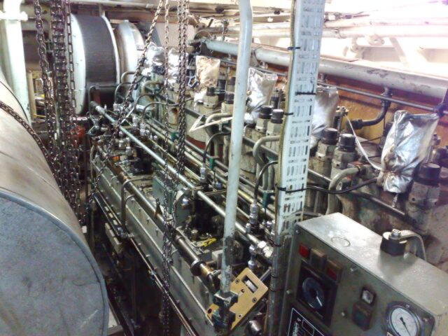 пройдя в машинное отделение,обнаружили там четыре небольших дизельных движка, каждый из которых около 1000 ЛС мощностью. Эти моторы двухтактные, в устройстве несложные.