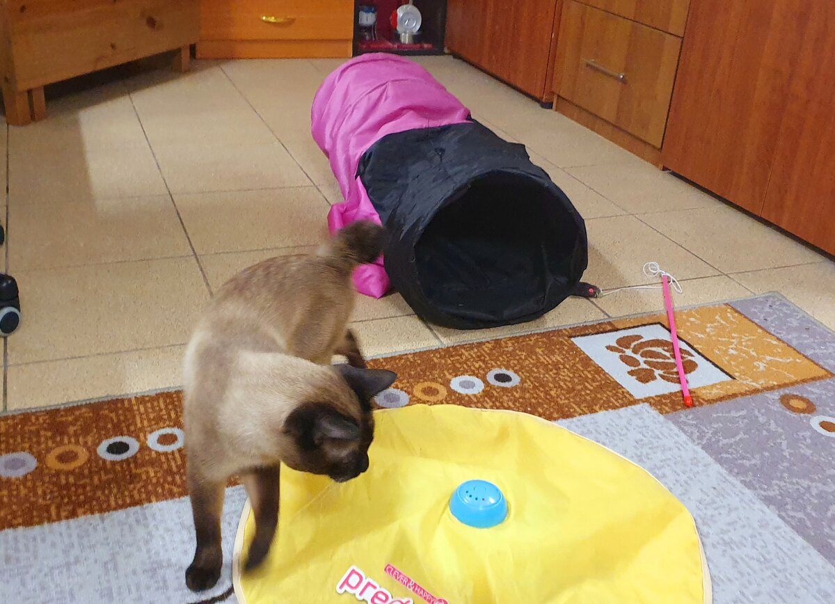 Продолжаем поставлять нашему временно "заключенному" на карантине коту Тише различные варианты игрушек :))) Как же ему нравятся кошачьи удочки с резинкой, на которой закреплены игрушки: мышки или еще какие неведомые зверушки :))) Он обожает динамику игр и выкручивает такие сальто, что после того, один раз Тиша в полете приземлился мне на голову, а второй раз я получила его задней лапой (которой он очень успешно отталкивается от любого препятствия) в нос, я теперь вынуждена отрабатывать и свои личные реакции, уворачиваясь от него :))) Забавный Тишка. Пока что не забывает кусаться и в попытках привлечь внимание, но зато появился новый прогресс: наигравшись вволю, он не поднимается в верхнюю комнату, чтобы проводить и попытаться не отпустить из домика :))) Скорей всего наоборот думает: ну сколько можно ждать - выход там 😺😁