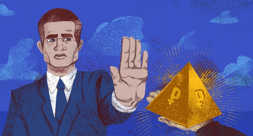 По мнению экспертов Банка России, страну накрыла третья волна финансовых пирамид. Первая была в девяностые, вторая в начале — середине двухтысячных. И нынешние пирамидостроители действуют более дерзко и нагло, чем их предшественники Классическая схема всё ещё в ходу Изначально это работало так. Человек вносит некую сумму, обычно объясняемую как своего рода вступительный взнос за само право принять участие в схеме и получать несметные богатства, после чего ищет 4-6 человек, кто тоже вносит сумму и получает от их взноса вознаграждение и становится главным над своими новичками. Те приводят ещё по 4-5 человек каждый и таким образом «основание» пирамиды расширяется, а основные доходы получают те, кто ближе к вершине. При этом обработанный до степени помрачнения сознания человек даже не отдаёт себе отчёт в том, что здесь работает геометрическая прогрессия и на всех просто не хватит новых участников; что достаточно произойти одному сбою, чтобы цепочка платежей прервалась и он перестал полу