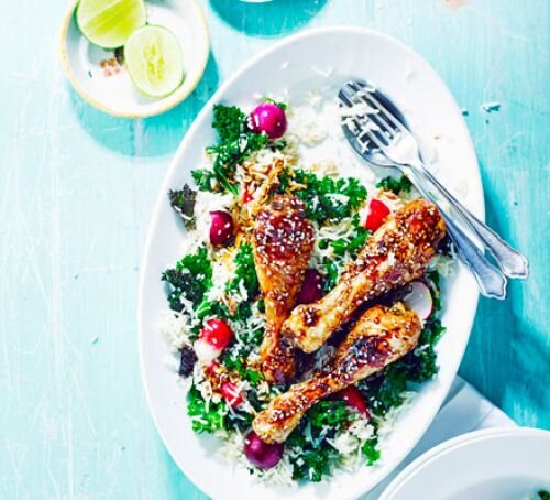Этот рецепт делает замечательный ужин или обед. Обязательно охладите рис и курицу, как только они остынут, а затем упакуйте в контейнеры. Ингредиенты : Нагрейте духовку до 200C / 180C. Поместите барабанные палочки в жаровню. Смешайте 2 столовые ложки меда, тамари, 1 столовую ложку растительного масла и 1 столовую ложку кунжутного масла в миске, затем налейте курицу - убедитесь, что каждый кусок покрыт. Жарить в течение 25-30 минут. Тем временем залейте рис 240 мл воды и доведите до кипения. Варить 8-10 минут до готовности. Массажируйте капусту с 1 столовой ложкой растительного масла в течение 5 минут до размягчения (это делает его менее жевательным). Сбрызнуть соком лайма, оставшимся кунжутным маслом и медом, и приправить. Добавьте редьку и отложите. Обжарьте рис в оставшемся растительном масле на антипригарной сковороде, чтобы высушить. Добавьте в капусту и перемешайте. Подавать барабанные палочки с салатом и посыпать семенами кунжута.