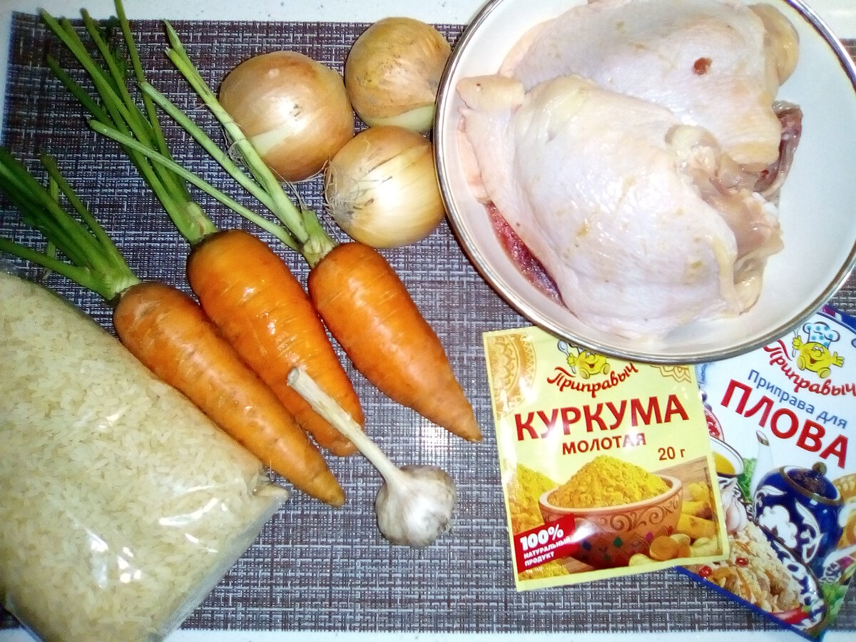 Сегодня я рассказываю, как готовлю плов. Делаю плов из доступных каждому продуктов, поэтому предвижу комментарии типа: «А настоящий плов готовится на курдючном жире! А мясо надо брать баранину или говядину!» Я всё это знаю. И пусть кто-то назовёт мой плов «ненастоящим». Зато он очень вкусный, красивый, рис в нём не слипается в пудинг, и расходы на продукты составят всего 220 рублей. Приступим! Ингредиенты: Куриное мясо (бёдра) – 4 шт. (1 кг) Луковицы – 3 шт. Морковь – 3 шт. Рис – 250 гр. Чеснок – 1 головка Куркума – 1 ст. ложка Смесь приправ для плова (паприка, зира, куркума, барбарис, перец красный молотый, сушёные томаты, сушёная морковь) – 1 ч. ложка Соль – 2 ч. ложки Вода – 700 мл. Растительное масло (рафинированное) – 100 мл. Бёдрышки разделываю на мясо и кости. Кости отправляю в морозилку – пригодятся потом для супа. А мясо рублю на кусочки и обжариваю минут 5 на растительном масле. Из килограмма бёдрышек получилось примерно 600 грамм мяса со шкуркой. Кстати, специального казана