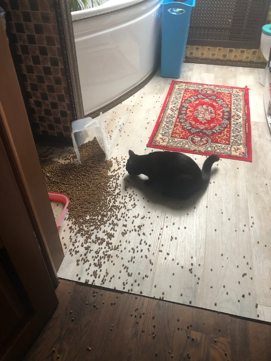 Как-то так получилось, что у нас четыре кошки и одна собака. Точнее кот, кошка и два котёнка. Кот наш - он вечно голодный. И куда бы я не спрятала корм он его находит. Вот и сейчас вытащил из шкафа. Рассыпал и ест. Поели, можно и поспать. Котята начали активно бегать и выбегают из комнаты при любой возможности. Но в коридоре таится опасность в виде собаки. Пришлось купить им домик. В клетке они будут в безопасности, когда нас нет дома или мы не можем за ними приглядывать. Кстати, оказывается клетки для котят стоят от 3,5 тысяч рублей и выше. Я нашла выход и купили клетку для морской свинки. Ничем не хуже. И места достаточно. Все удовольствие 1,5 тысячи рублей. Все поместилось: и лежанка и туалет и миска.