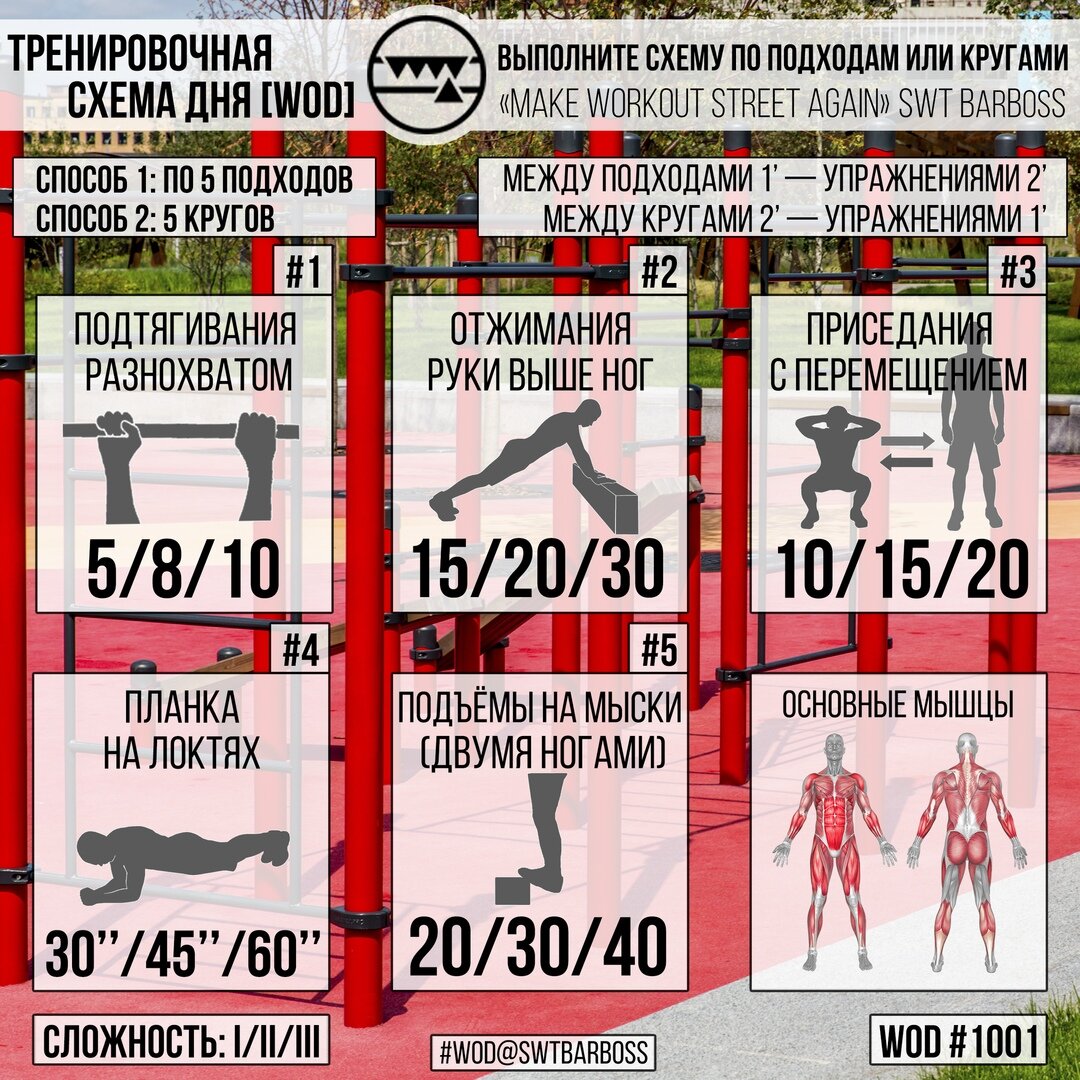 Тренировочные схемы с использованием веса собственного тела на все группы мышц (Часть 1). Заниматься можно и дома, и на улице. Два варианта выполнения (по подходам или кругами) и 3 уровня сложности на ваш выбор. Способ выполнения 1: Сделать по 5 подходов в каждом упражнении. Между подходами 1 минута отдыха, а между сменой упражнений - 2 минуты. Способ выполнения 2: Сделать 5 кругов, между упражнениями 1 минута отдыха, а между кругами - 2 минуты. *Способ выполнения 3: Сделать как можно больше кругов на первом уровне сложности, но с минимальным отдыхом как между упражнениями, так и между кругами. Данные схемы относится к категории "Fullbody" т.е. в них задействовано множество мышечных групп. Если вы хотите использовать их всю неделю, то выберите чуть меньший уровень сложности, чем мы можете выполнить. В противном случае, стараясь выполнить каждый раз свой максимум, вы "перегорите". В теории должны научить вас комбинировать упражнения самостоятельно, чтобы в дальнейшем вы могли сами соз