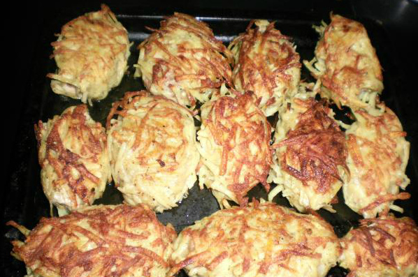 Гомельская котлета Ингредиенты 2. Тонко нарежьте мясо, отбейте с двух сторон, посолите и поперчите. На каждый кусок выложите по 1 ст. л. начинки, сложите мясо конвертиком, сформируйте котлету. 3. Картофель очистите и натрите на крупной терке, яйцо взбейте, муку насыпьте в мелкую тарелку. Каждую котлету обваляйте в муке, окуните в яйцо, затем в картофель, слегка придавливая его руками. 4. Обжарьте котлеты с двух сторон до золотистой корочки. Готовые изделия выложите на противень, затем отправьте в духовку на 15 минут. Температура должна быть 180 градусов. Сытные котлеты подавайте с простым овощным салатом: этого будет достаточно для полноценного вкусного ужина.