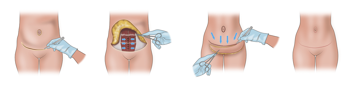 Первый этап операции включает: доктор производит в нижней части живота небольшой надрез и очень осторожно отделяет лоскут кожи вместе с тканью жира до бёдер, а потом выполняет повторный надрез, но уже вокруг пупка и проводит его отслаивание. Как только, этот этап выполнен врач устраняет новообразования грыж или убирает мышечное расхождение. Вместе с этим устраняются все отложения жиров и излишки кожи.