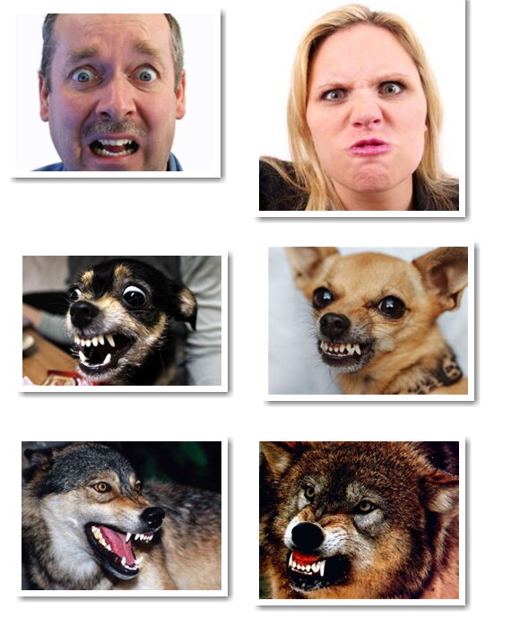 Конечно, собаки зачастую демонстрируют смесь разных эмоций — как и люди. Но увидеть основные отличия между страхом и гневом вполне можно. Чтобы было легче разобраться, давайте сравним гримасы страха и гнева человека, собаки и волка: