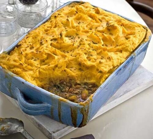 - Разогрейте духовку до 200 ° С . Положите смесь ягненка в большую жаропрочную посуду и равномерно разровняйте, сверху положите охлажденное картофельное пюре. Также разровняйте по всей поверхности посуды.