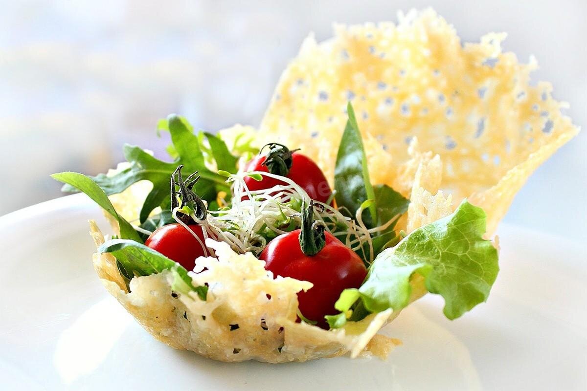Такая закуска выглядит очень аппетитно и способна украсить любой стол. Изюминка блюда в красивой подаче салата, который может быть самым разным – от салата на основе креветок, лосося, курицы и грибов до простого микса из яиц, огурца и зелени. С сырным вкусом превосходно сочетается практически любая начинка. Главное, чтобы салат был легким, с минимум соуса и без излишней сочности, чтобы корзинки не размякли. В каждом ресторане сырные корзинки с салатом – это уникальный микс сочетаний, подобранный шеф-поваром. Предлагаем одну из уникальных рецептур – кнели с лососем в сырной корзинке Ингредиенты: для корзинки: сыр Пармезан, Гауда. для крем-чиза: семга, фета, укроп, сметана. для салата: фризе, радиччо, лола-россо, оливковое масло, креветки, лимон. для украшения: овощной тар-тар, лук чавис, петрушка. Технология: 1. Замариновать семгу. Маринад может быть любым. 2. Готовим сырную корзинку. Сыры натираем на крупной терке. Разложить сырную стружку кружками на противне, застеленном пергамент