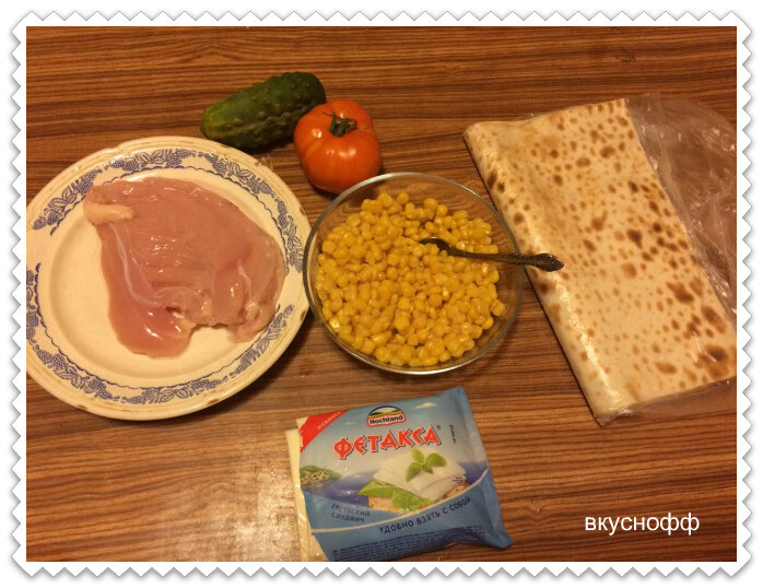 Не помню, точно где прочитал данный рецепт, но нам понравилось. Сегодня вечером гуляя по магазину захотелось, чего то вкусненького и на скорую руку. Я решил приготовить шаурму с кукурузой и легким творожным сыром. Итак для начала на 2 порции нам понадобятся следующие продукты: 1. Филе курицы 150-200 гр 2. Сыр творожный примерно гр. 100 3. Перец сладкий 1/2 шт 4. Помидор 1 шт. 5. Огурец 1шт. 6. Лаваш армянский 100 гр. ( Большой лист разделил на 2 части) 7. кукуруза 150 гр ( кому как нравиться можно больше или меньше) 8. Майонез по вкусу Начнем моем филе, далее режем его средними кусочками солим, перчим. Далее обжариваем на растительном масле на сильном огне постоянно помешивая минут 5-7. Нарезаем помидор, сладкий перец, огурец соломкой. Режем лаваш на две равные части, центр лаваша смазываем майонезом далее выкладываем пластинку сыра, затем филе, затем овощи. Сверху посыпаем кукурузой. Заворачиваем все в конверт. Немного поджариваем с двух сторон на сковороде где до это
