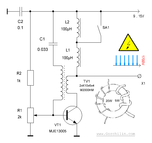 Недавно нашел схему небольшого качера и решил откатать ее от и до. Вот кстати и она Собрал я ее включил все работает. Хотел снять в нагрузку ,но есть одно "но" . Нагрузка в виде лампочки моргает и все. От номиналов деталей почти ничего не меняется . Потребление схемой можно выставить от 100мА до 800мА. При этом лампочка на 11 вт светодиодная моргает . Питание 12в. Сейчас пытаюсь сгладить эти импульсы , но пока ни как. Кондеры не помогают. Видно что небольшая прибавка по мощности уже есть. Вот она и мои измерения Транзистор зажат в тиски чтоб не грелся. А максимальное пиковое напряжение 1300в постоянки после диодного моста. Осцилограф подключал импульсы как на картинке со схемой.
