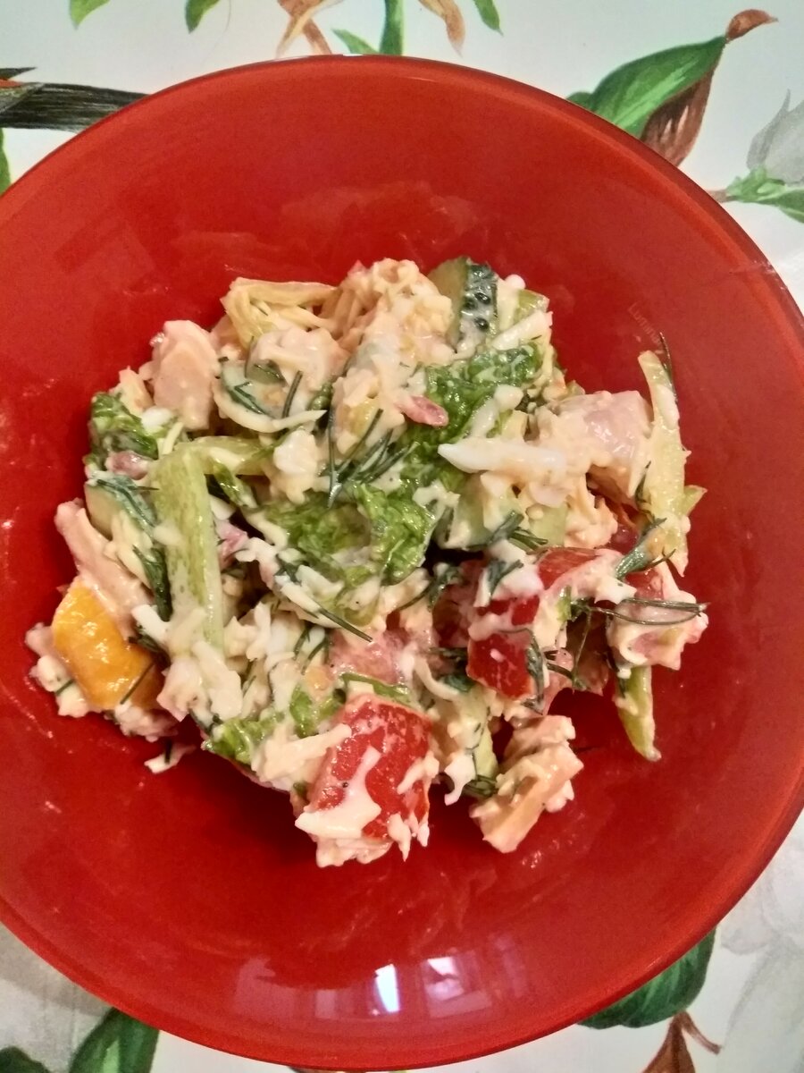 Для разнообразия повседневного рациона, а также встречи гостей нам на помощь приходит этот рецепт салата. Все нижеизложенные ингредиенты нужно нарезать, в одной емкости посолить, поперчить, заправить майонезом и тщательно перемешать. Речь идет о следующих ингредиентах: Ингредиентов достаточно на 4-5 порций. Салат получается сытным, вкусным, с выраженным вкусом овощей и тонкой ноткой копченостей. В общем, мы и наши гости всегда в восторге. Рекомендуем! Советуем также удивить гостей другими нашими рецептами: Аналог котлет по-киевски: Готовим котлеты не по-киевски, а по-русски Готовим полезный сельдереевый суп: Быстрый суп, который вас восстановит Печем вкусные пирожки с вишневой начинкой: Очень вкусные мини-пирожки без хлопот