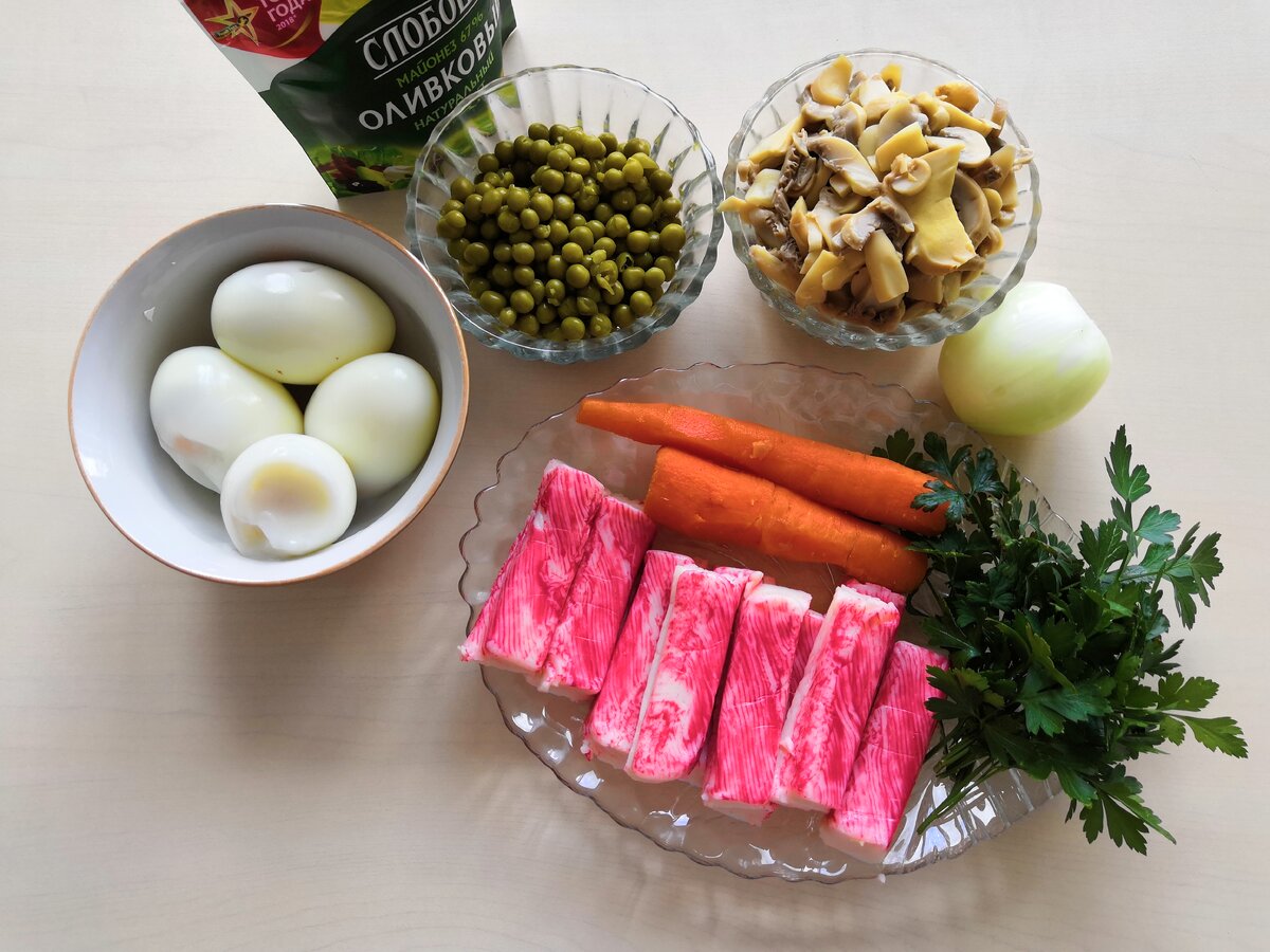 Так захотелось мне на днях салатика с маринованными грибами и крабовыми палочками, что как только уложила детей на тихий час, принялась его готовить. Салат получается безумно вкусным. Попробовала его первый раз у подруги в гостях, еле оторвалась от него. Так была рада, что она именно этот салат приготовила к встрече со мной. :) А сейчас пишу для вас этот рецепт и снова слюнки текут, так как салата уже давно нет, а статья пишется только сейчас. :)) В тот день, когда я готовила этот салат, мы ещё навещали нашу бабушку. Ей, конечно же, я прихватила в контейнере его. На следующий день она позвонила мне, и отметила, что это был очень и очень вкусный салат. И ещё пошутила почему так мало привезла. Обязательно приготовлю его ещё раз, и вам советую. Ингредиенты 👇 ▪️Крабовые палочки (упаковка);