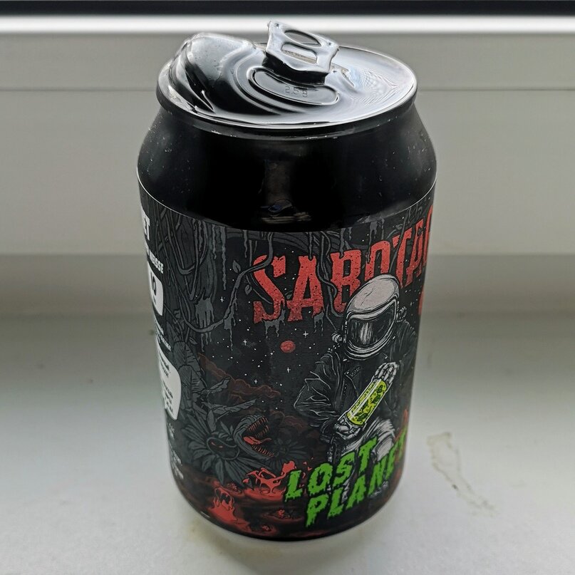 Проснулся я на неделе от громкого хлопка на кухне и последующего шипения… то что не показалось, доказали коты, вскочившие и озирающиеся в недоумении. Пришлось вставать в полпятого утра и искать причину внезапного беспокойства, которой оказалась баночка от Sabotage Brewery. Бахнуло относительно скромно, не зацепив соседей и только слегка залило стол: Днём я пожаловался на такие утренние приключения и вечером получил компенсацию в виде нормальной баночки. И ничего не оставалось делать, как сравнить обе: Думаю, понятно, где какая: Наливаю… и небольшую разницу заметно сразу — «целая» версия отличается от «взорванной» заметным розовым оттенком: Поскольку баночки из разных точек, проверил, на всякий случай дату… оказалась одна: А что же по содержимому каждой? «Целая» версия встречает если не рассольным, то лёгким таким маринадным вкусом. Видимо, так раскрывается базилик. Да, есть заметная кислинка, но сглаживается ягодной сладостью. Очень освежающая штука, приятно щиплющая рецепторы. Взорва