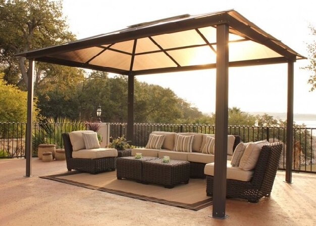 В соответствии с проектом, который был вами разработан и эскизами с нанесёнными размерами, вашими руками была построена беседка на даче. Теперь встал вопрос о выборе кровли и вида крыши, как завершающий этап строительства. Крыша, как венец постройки должна завершать вашу работу подчёркивая мастерство, вкус и творческий подход хозяина. Перебрав несколько вариантов, остановились на крыше для беседки из поликарбоната. Виды и форма покрытия Поликарбонат давно зарекомендовал себя как отличный кровельный материал, имеющий свои достоинства и, к сожалению, недостатки. Сам материал выпускается двух видов, это ячеистый и монолитный. Монолитный поликарбонат для кровли на беседку будет слишком дорогим удовольствием, а вот ячеистый, да еще и цветной, будет в самый раз. Единственным недостатком ячеистого поликарбоната является низкая механическая прочность, по нему нельзя ходить, выполняя кровельные работы на беседке с крышей из поликарбоната. Он быстро стареет под действием ультрафиолета от солнеч