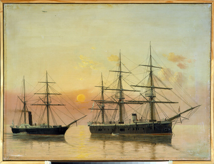 Как я и обещал - вот картина с "Князем Пожарским" и неким колёсным корабликом. Картина прекрасна и интересна заходом солнца поздним вечером. "Пожарский" стоит на якоре и к нему подходит "колёсник". Учитывая , что фрегат окончательно вступил в строй лишь к 1873 году , мы можем предполагать датировку картины. Ну сам фрегат не очень интересен конструкцией , разве что тем что был первым железным корпусом в нашем флоте. Но один интересный момент есть : успехи русской металлургии и электрохимии вместе с пустой казной привели к тому что при срочной модернизации 1875-77 годов подводную часть корабля обшили не медными , а цинковыми листами! Мачты "Пожарский" нём металлические и активно ими пользовался , благо кго водоизмещение не превосходило крупных парусников - зафиксирована цифра его походов под парусами во время службы на Дальнем Востоке (1878-82г.г.) - более 8000 миль. Учитывая , что в модернизацию 1875=77 годов корабль с новыми котлами получил и вторую трубу ... мы можем сократить временн