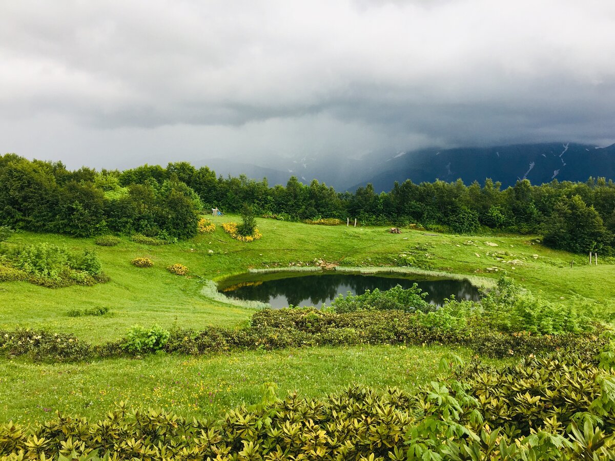 Следующий объект интереса – оз. Зеркальное (с краснокнижными тритонами в нем) или «Метеостанция». Метеостанцией это место называют, потому что она здесь была и именно она и зафиксировала наибольшее количество выпадающих осадков на территории СССР. Теперь остались только воспоминания и фундамент. Увидеть метеостанцию, а также прикинуть высоту снежного покрова можно теперь только по старым фотографиям(( Оз. Зеркальное – это официальное место для ночевки на этом маршруте (Заповедник же ж). Вокруг озера в зарослях рододендронов есть несколько обзорных площадок – и тут лучше оказаться не в туман и не в облачную погоду, поскольку тогда ваше воображение может отдохнуть и ничего не дорисовывать – виды на все 100! Вернее – на 360! Даже если вы не запомните названия и высоты окружных вершин, картинку вы зафиксируете надолго! Гарантируем! Здесь строго рекомендуется устроить привал и обед, а дальше – по настроению. Сильные духом и телом могут прогуляться к Ачипсинским водопадам и тем самым приблизиться к вершине Ачишхо (маршрут на саму вершину закрыт).