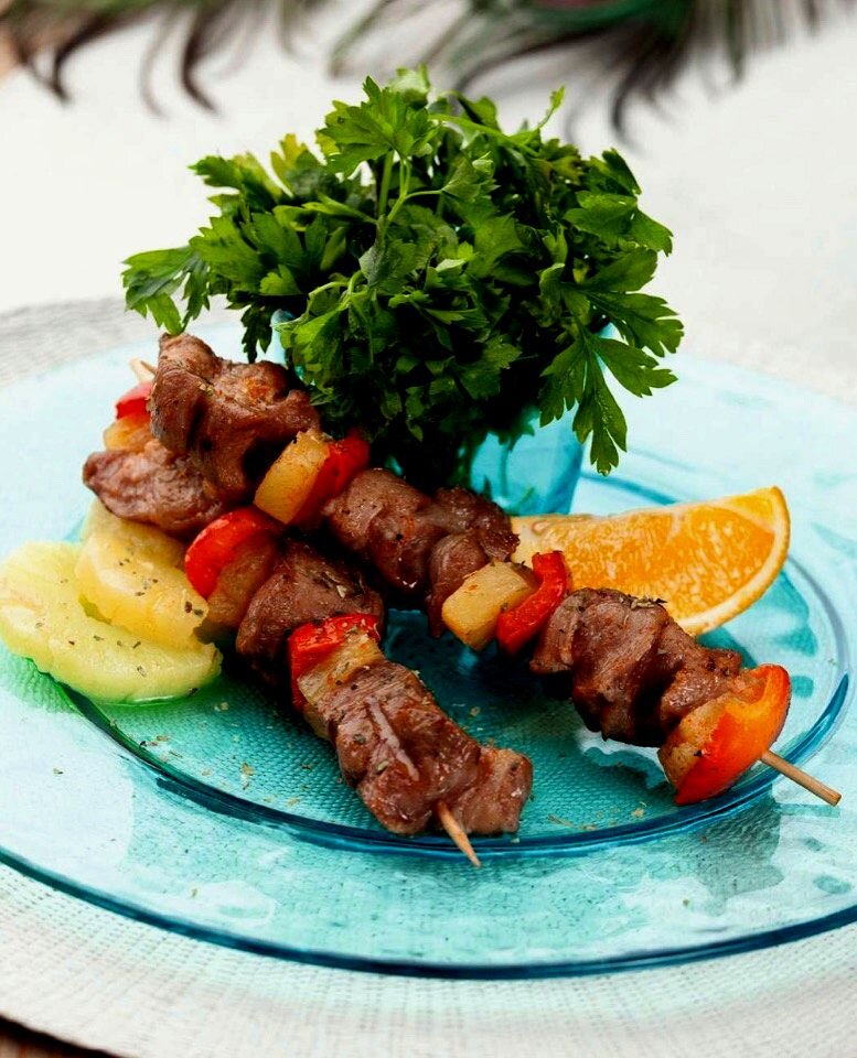 1. 600гр мяска хрюши, моем, обсушиваем и режем кусками (3*3см, примерно). 2.3 сладких перчика чистим и шинкуем квадратиками, также 3*3 см. 3.Ананас (400 гр, свежий или конс.- не важно) режем также 3*3 см. 4. Все смешиваем и добавляем 1/2 ч.л. молотого чили. 5. Солим на свой вкус.Лучше соль покрупнее. 6.Полить все маслом оливы(50мл).Закрываем т ставим в холодильник на 2-3ч. для маринования. 7.Надеваем на шампур по очереди, мяско, перец и ананас. 8. Поджариваем на умеренных углях 7 мин. постоянно переворачивая.