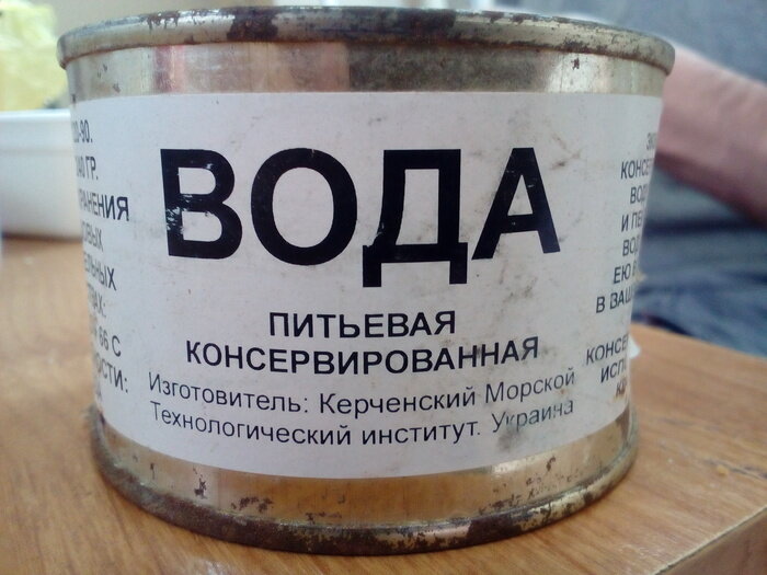Был в командировке и в одном из заброшенных помещений нашли ящик с консервированной водой. Я ее раньше только на картинках видел, а тут вот неожиданно так) Эта вода предназначена для индивидуального употребления на спасательных шлюпках и плотах морских судов. Если вдруг морякам приходилось покинуть корабль и провести несколько дней в море, им очень помогали такие консервы, ведь соленую воду не попьешь! Воду специально подготавливали, кипятили, добавляли немного аскорбиновой кислоты. Запас был рассчитан на трое суток (по 0,5 л на человека в сутки). Она довольно долго хранилась. Фотографировал на тапочек, прошу сильно не пинать)
