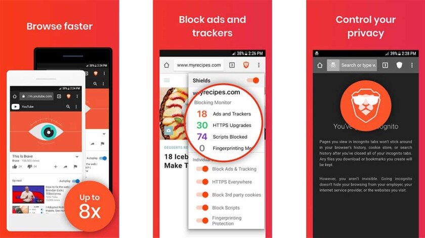 Brave Browser — один из самых новых браузеров Android. Он вышел в 2016 году и имеет множество функций. Встроенный блокировщик рекламы. Кроме того, он может блокировать сторонние файлы cookie, блокировать сценарии и везде использует HTTPS. Включены настройки для каждого сайта на тот случай, если это нужно. Он также может похвастаться оптимизацией по скорости и времени автономной работы. Можно даже отслеживать всё, что он блокирует. Он очень функциональный и даже иногда забавный в использовании. Он снабжен большинством основных функций, таких как закладки, история и режим конфиденциальности (инкогнито). Приложение полностью бесплатное, без покупок и рекламы в приложении.