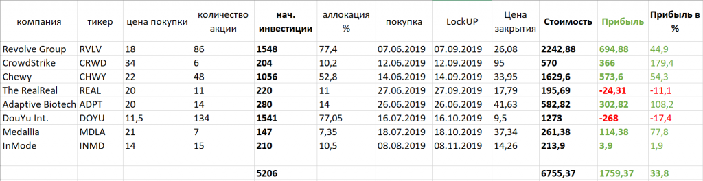 Всем привет! Традиционно публикую промежуточные результаты участия в IPO. Прибыльность падает. Как видим доходность вложений существенно сократилась. В ранее тянущему вниз DouYu присоединился The RealReal. Также существенный вклад в падение внес Revolve Group, который просел аж на 17% за день на отчете, в котором зафиксирован рост выручки и падение прибыли. На данный момент имею 33.8% доходности без учета комиссии за участие. Которая составляет 5% от суммы в компании Freedom Finance, через которую я участвую в IPO. Почему не кроюсь форвардами? Сам не знаю, ответ на этот вопрос. Наверное — это сильно дорогой инструмент, хотя как знать. Но продавать бумаги с дисконтом более 15% от рынка, как-то жалко. Хотя если бы сделал это на хаях, то сидел бы в огромном плюсе. Резюме. На мой взгляд сфера IPO демонстрирует зависимости от общего рынка, положение которого, в последнее время под угрозой. Но об этом в отдельной статье. А пока продолжаю работать в направлении улучшения условий участия в I
