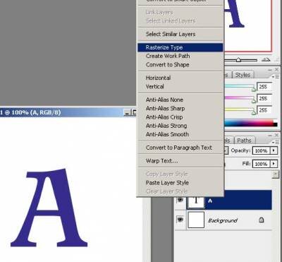 (Чтобы превратить текстовый слой надписи в растровый, щелкнем на пиктограмму слоя в палитре слоев правой кнопкой и выберем Rasterize Type).