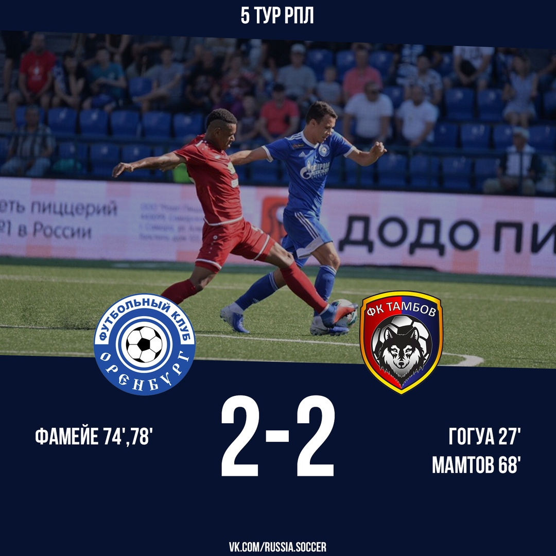 10 августа на стадионе "Газовик" в городе Оренбурге, в 5 -м туре РПЛ состоялся матч между одноименной командой фк"" и фк "Тамбов". Матч закончился огненной ничьёй. У гостей отличились Гогуа на 27-й минуте, и Мамтов на 68 - мой минуте. Команда хозяев смогла отыграться на 74-й, и 78-й минутах, дублем в ворота Тамбова отличился вышедший на замену Фамейе. Можно сказать что Фамейе своим дублем отсрочил отставку главного тренера "Оренбурга" Владимира Федотова. Рассмотрим состав хозяев на игру: как мы видим, скамейка запасных оставляет желать лучшего! И вроде бы, и игроков ротации катастрофически мало, и соперники в предыдущих 4-х турах были именитее, но этот факт, в большем случае мало кого интересует. В глаза бросается только тот факт, что после 5-ти прошедших туров, у подопечных Владимира Федотова только одно набранное очко! Не скажу что Оренбург прям плохо смотрелся в предыдущих матчах, наоборот, хочу отметить их боевой настрой в каждом матче, и незаслуженно ноль набранных очков, в м