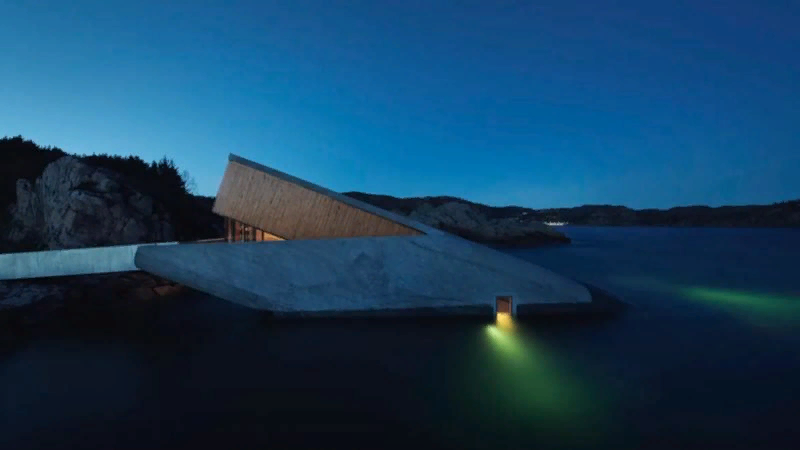 Соленый воздух Северного моря смешивается с густыми серыми облаками, уходящими на задний план, общая сцена для холодного прибрежного пейзажа. 20 марта 2019 года на самой южной оконечности Норвегии первый в Европе и самый большой в мире подводный ресторан встретил гостей. В нем прослеживается связь между дизайном окружающей среды, морскими исследованиями и изысканными презентациями блюд.