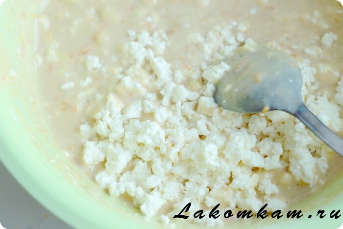 Ингредиенты: кефир – 200 миллилитров; сахар – ½ стакана; яйца куриные – 1 штука; апельсиновая цедра – 2 чайные ложки; вишневый топпинг – 3 столовые ложки; творог – 2 столовые ложки; мука – 3 столовые ложки; сода – 1/3 чайной ложки.